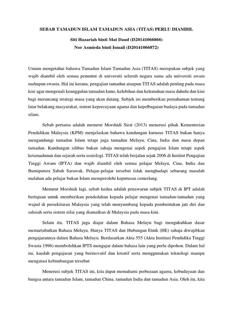 Essay On Tamadun Islam Dan Tamadun Asia Esei Titas Atau Nama Panjangnya Tamadun Islam Dan Tamadun Studocu